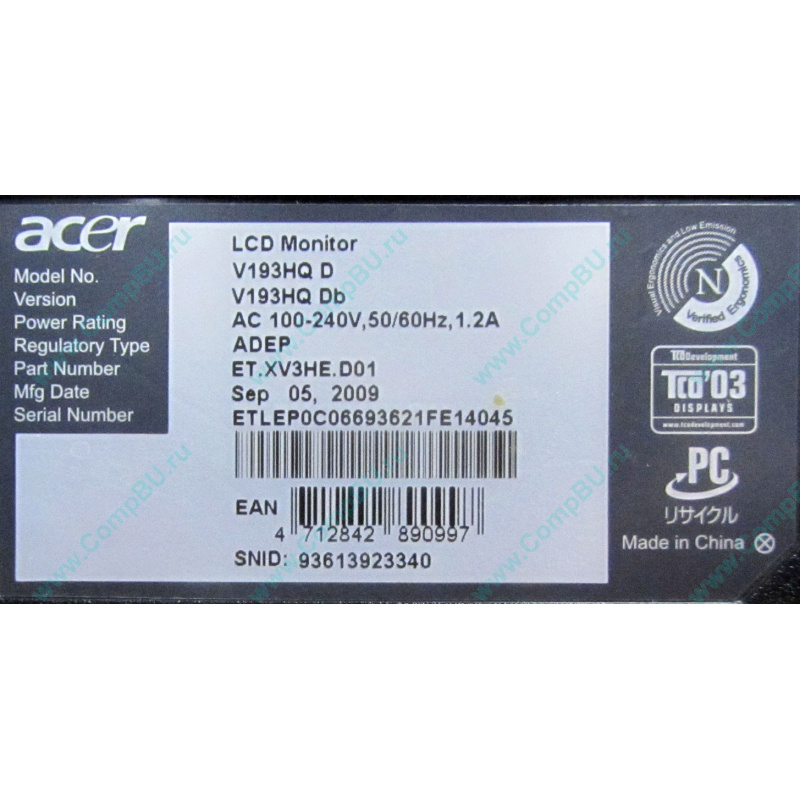 Б/У монитор 18.5" TFT Acer V193HQ Db 1366x768 широкоформатный, цвет черный. Состояние хорошее.